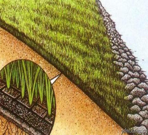 三維植被網(wǎng)是以熱塑性樹脂為原料,采用科學(xué)配方,經(jīng)擠出、拉伸等工序精制而成。它無腐蝕性,化學(xué)性穩(wěn)定,對大氣、土壤、微生物呈惰性。該產(chǎn)品底層為一個高模量基礎(chǔ)層,采用雙向拉伸技術(shù),其強(qiáng)度高,足以防止植被網(wǎng)變形,并能有效防止水土流失。表層為一個起泡層,膨松的網(wǎng)包以便填入土壤、種上草籽幫助固土,這種三維結(jié)構(gòu)能更好地與土壤相結(jié)合。在邊坡防護(hù)中使用三維植被能有效地保護(hù)坡面不受風(fēng)、雨、洪水的侵蝕。該產(chǎn)品功能是有利于植被生長。隨著植被的形成,它的主要功能是幫助草根系統(tǒng)增強(qiáng)其抵抗自然水土流失能力。