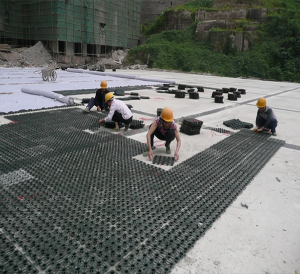 蓄排水板的安裝施工根據(jù)設(shè)計(jì)圖要求鋪設(shè),板材采用扣合的搭接方式。